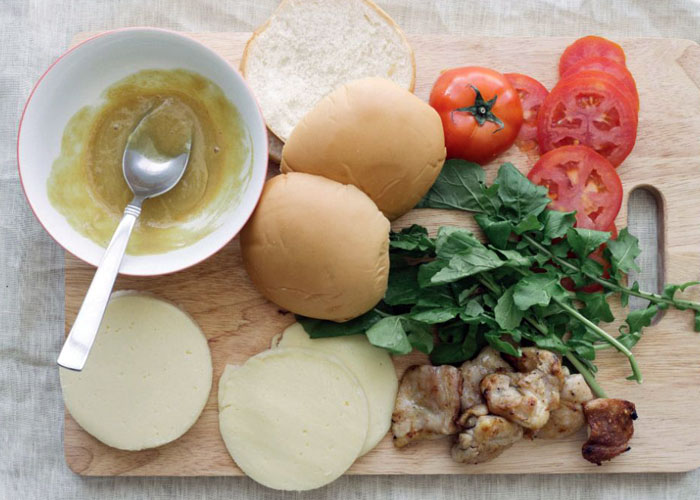 - Place the sliced tomatoes, grilled chicken and place a few of arugula, followed by aged white cheddar cheese.