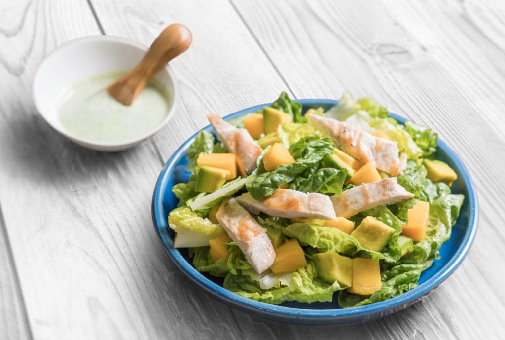 - Combine lettuce, mango, avocado and chicken in a salad bowl.