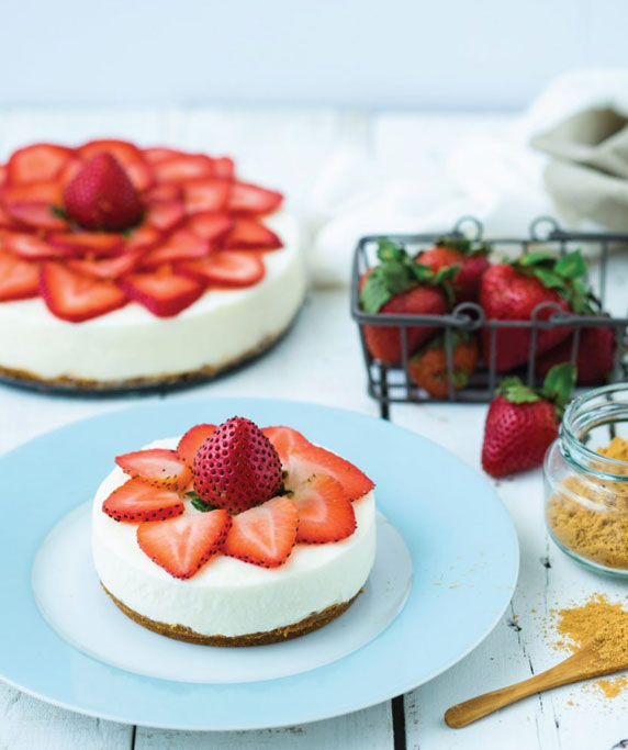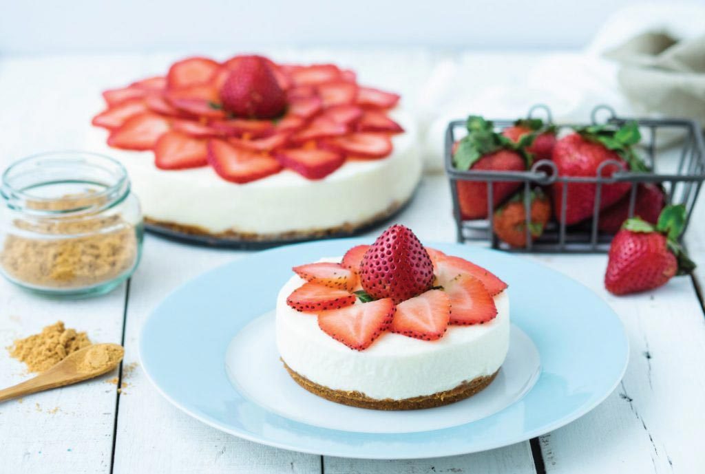 - Arrange strawberry slices beautifully on top of cheesecake.