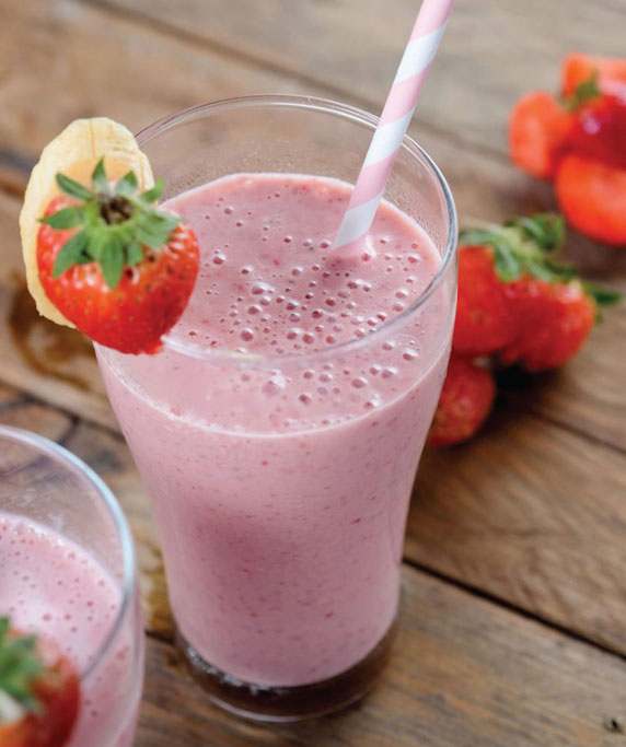 • In a blender, combine frozen yogurt, bananas, strawberries, milk, and honey and blend until smooth and frothy.