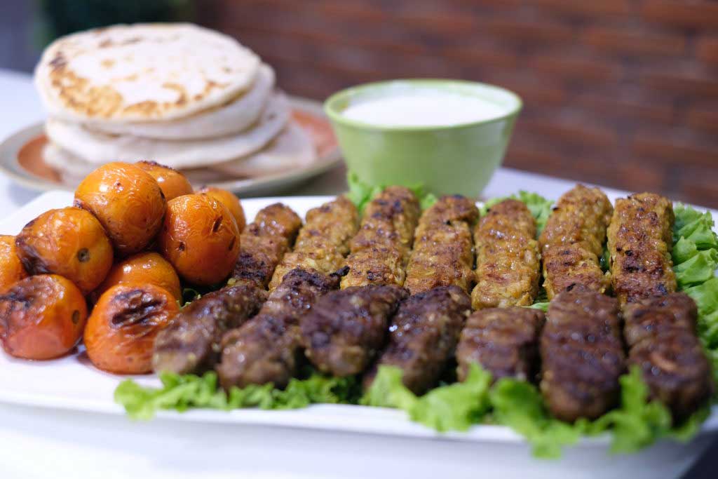 Grilled Chicken and Beef Kebabs with Homemade Pita Bread, Garlic-Yogurt Sauce and Grilled Tomatoes